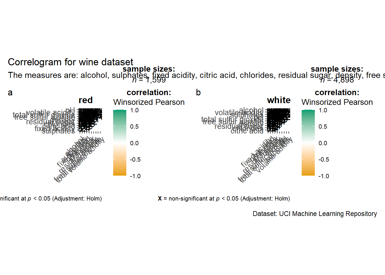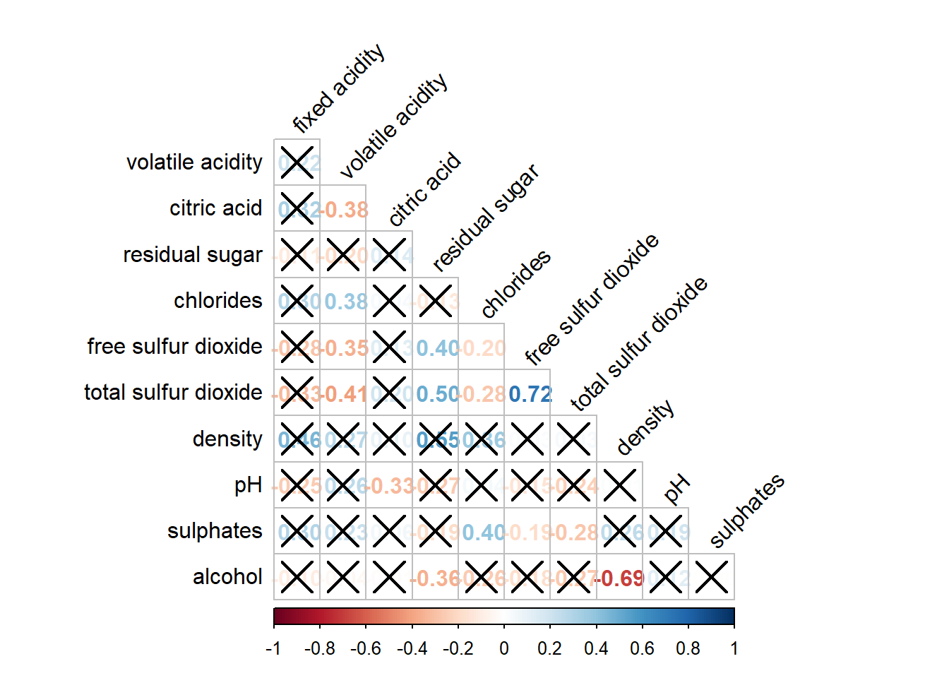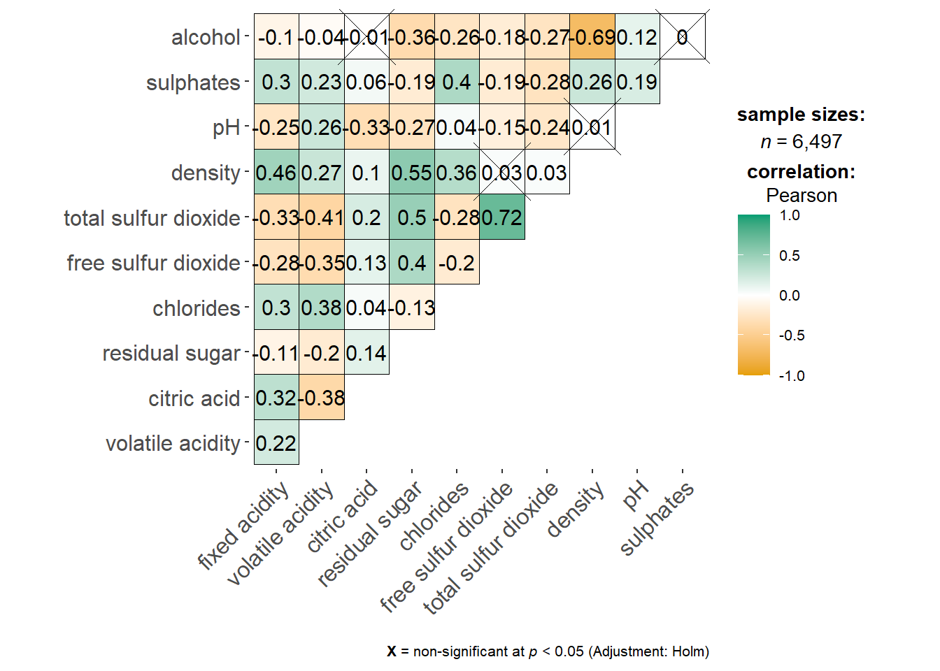 wine.sig = cor.mtest(wine.cor, conf.level= .95)We can then use the p.mat argument of corrplot function as shown in the code chunk below.