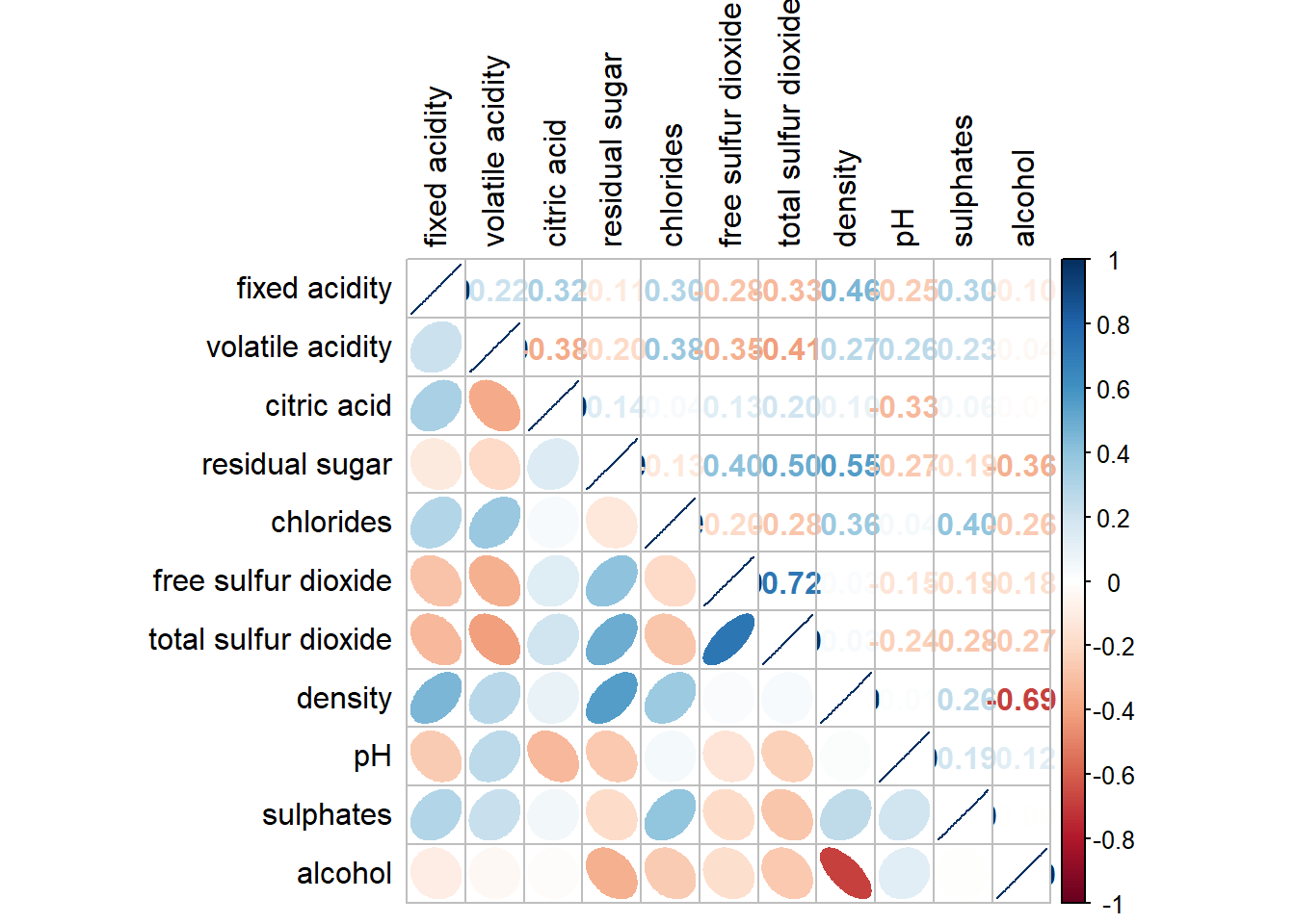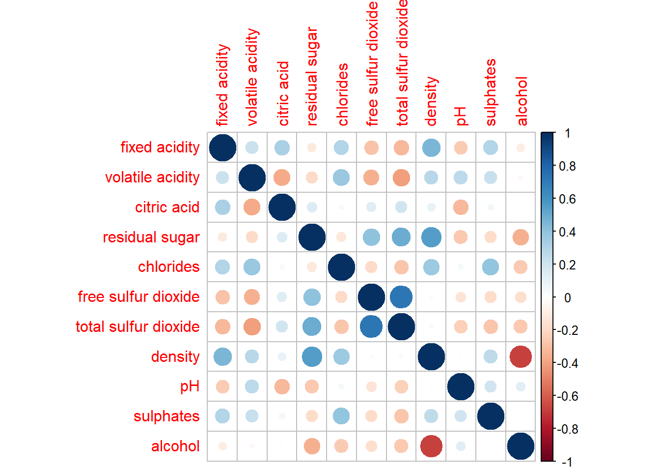 Before plotting a corrgram using corrplot(), we need to compute the correlation matrix of wine data frame.