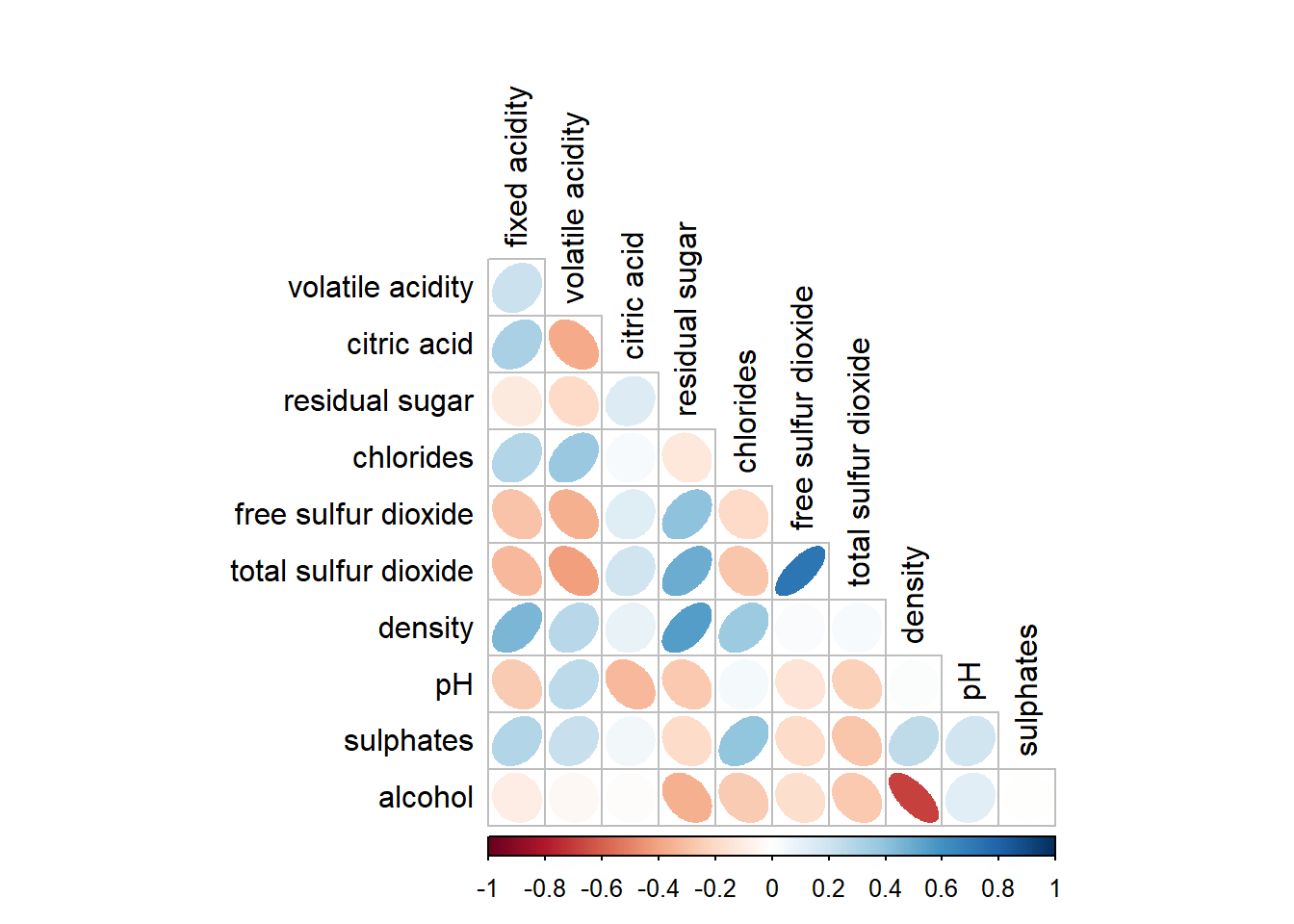 Figure below shows a mixed layout corrgram plotted using wine quality data.