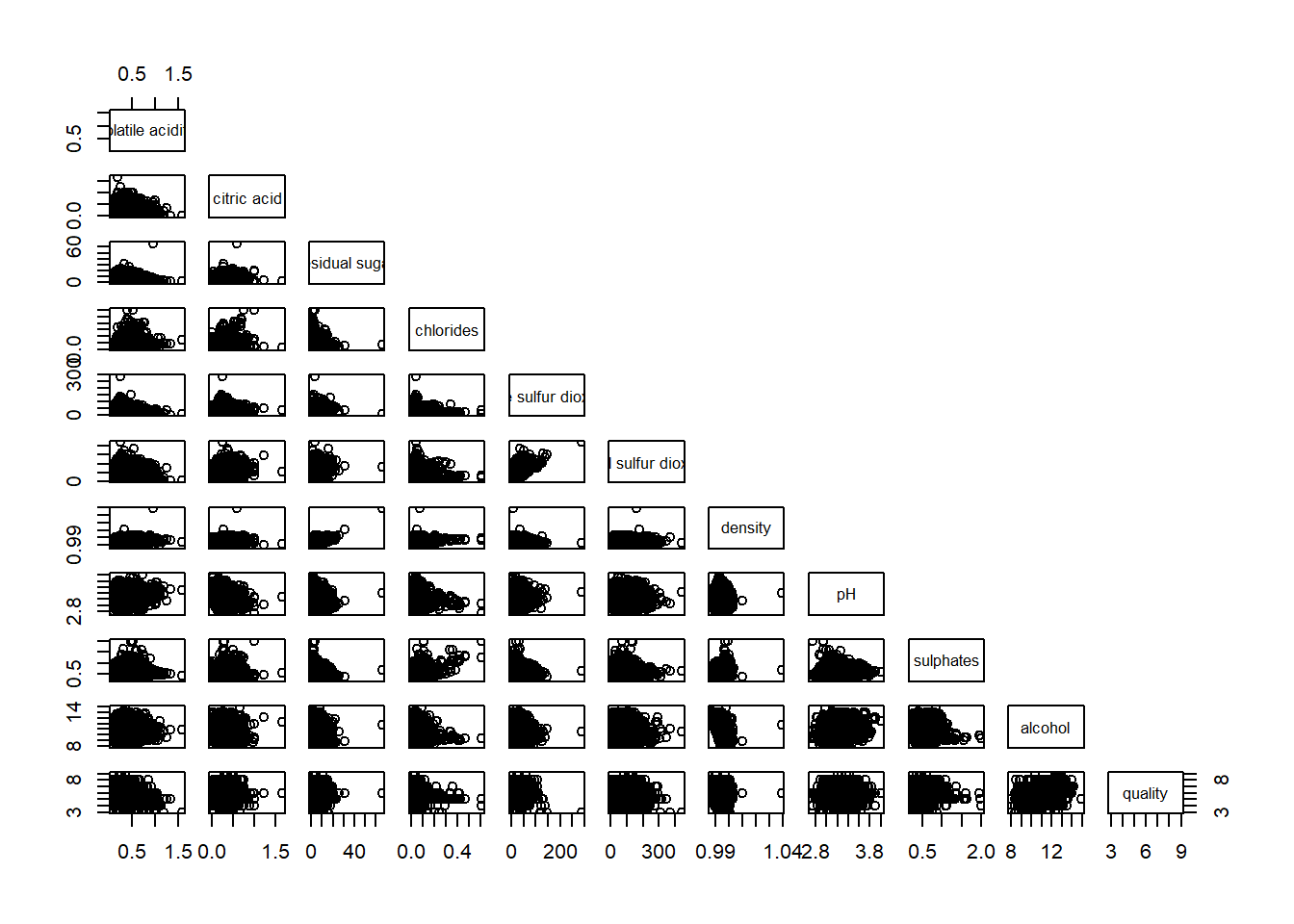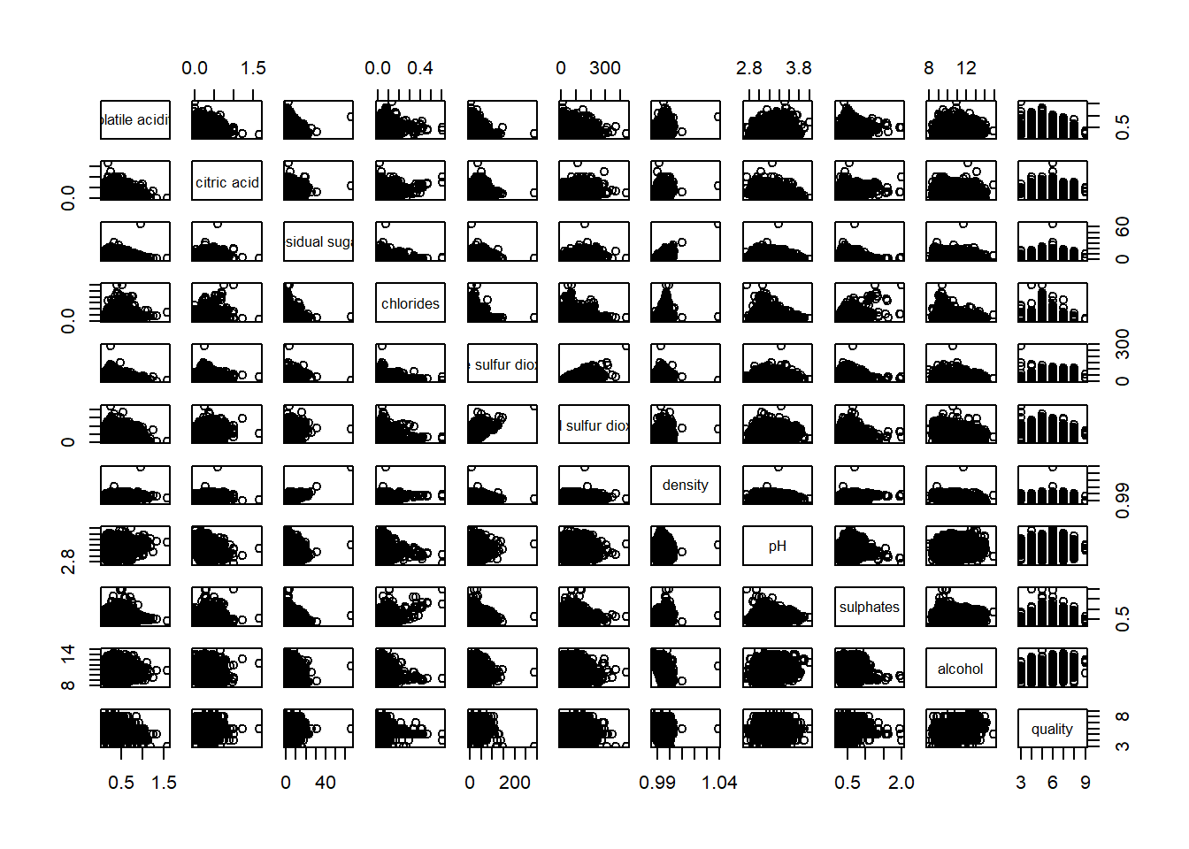 Figure below shows the scatter plot matrix of Wine Quality Data. It is a 11 by 11 matrix.